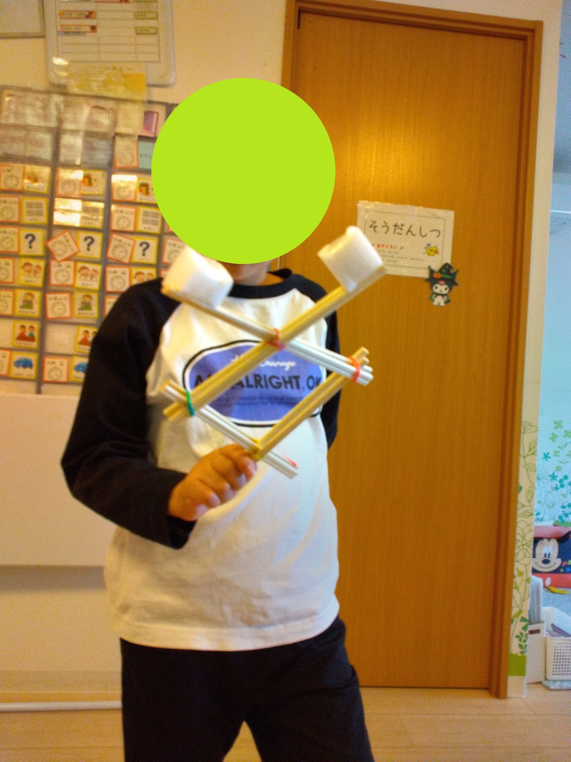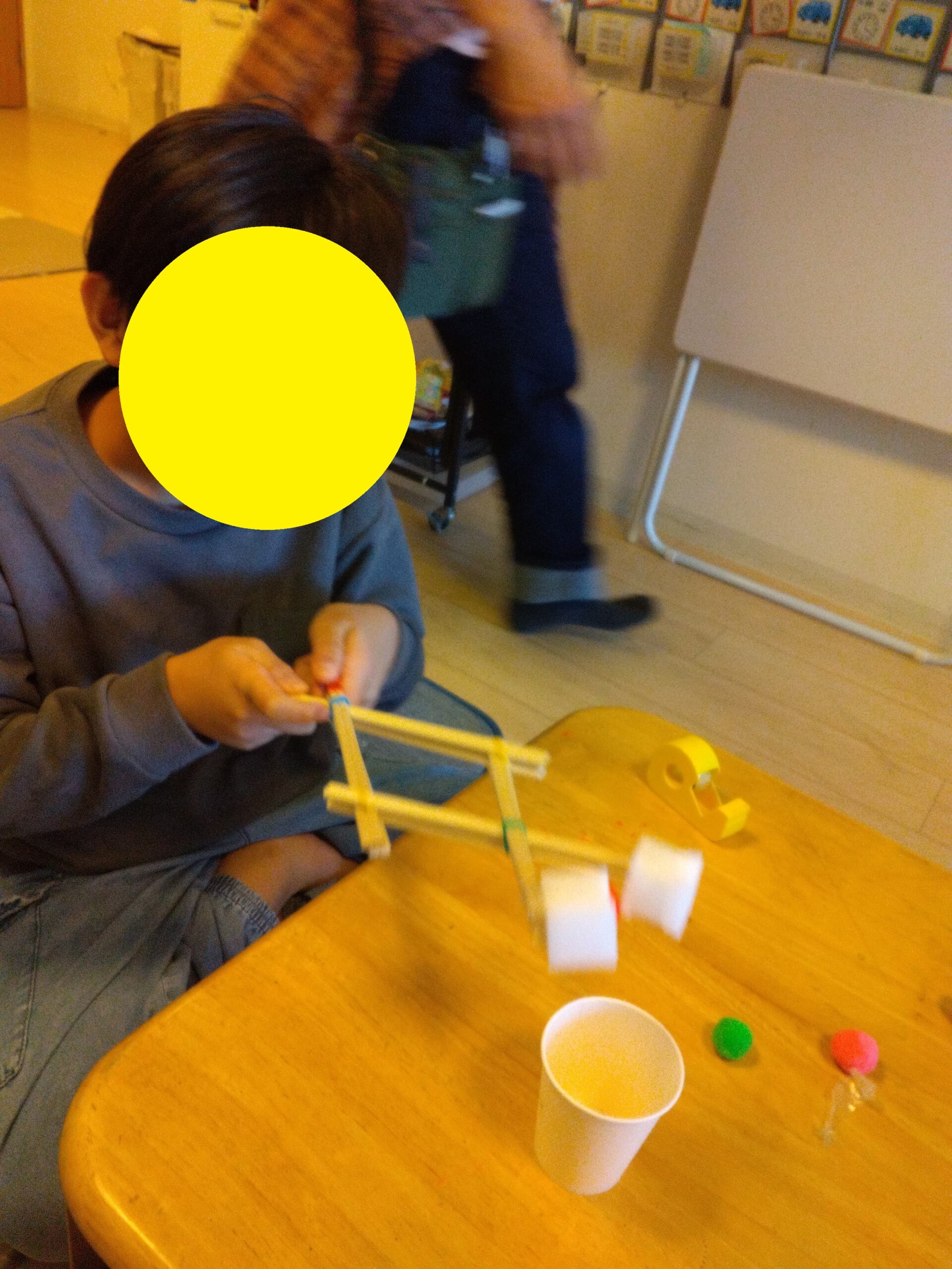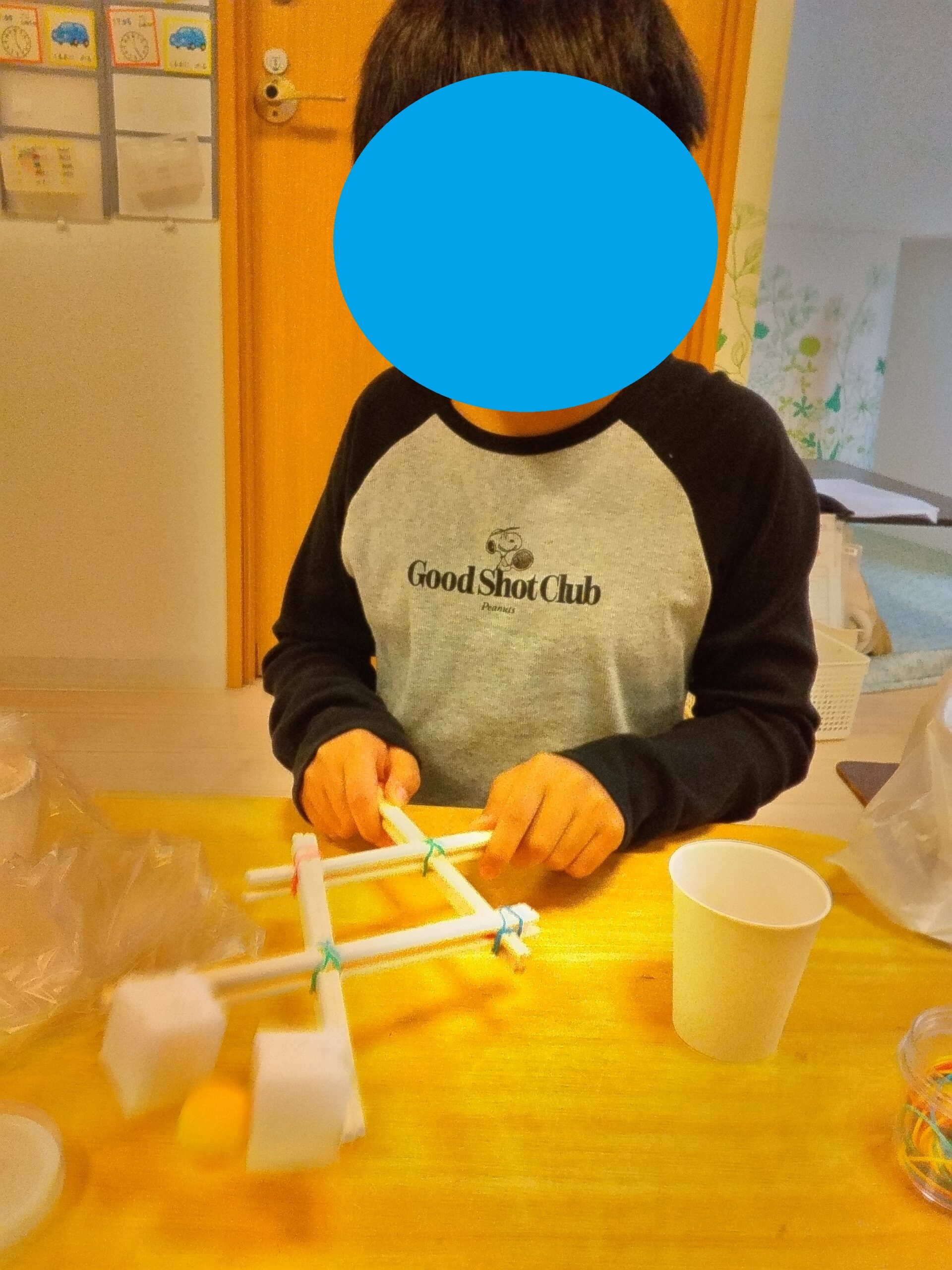 輪ゴムを巻いたり、スポンジをセロテープで貼ったりと、難しい作業が多かったのですが、周りのお友だちと協力しながら頑張っていました!